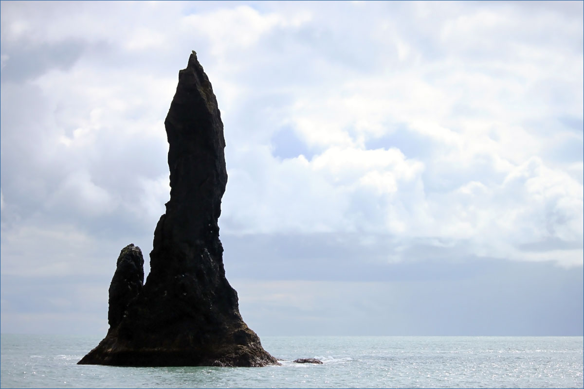Voor de kust in zee ligt Reynisdrangar, dit zijn zwarte basaltzuilen van zo’n 66 meter hoog.