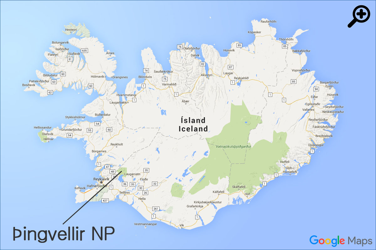 Þingvellir National Park. Het park bestaat al sinds 1928 en is een 6 km brede en 40 km lange verzakking die de geologische grens vormt tussen het Europese en het Noord-Amerikaanse continent. Hier kan je het directe gevolg zien van het uiteendrijven van de tektonische platen.