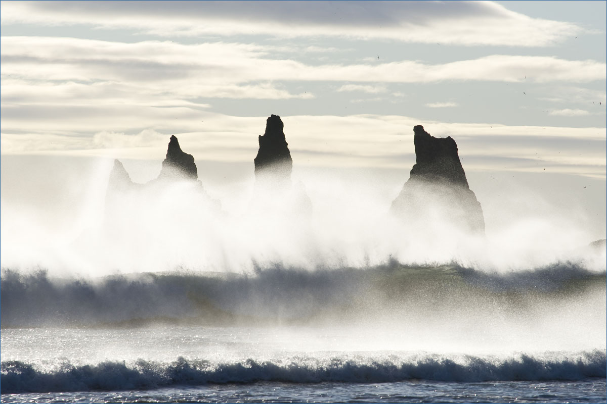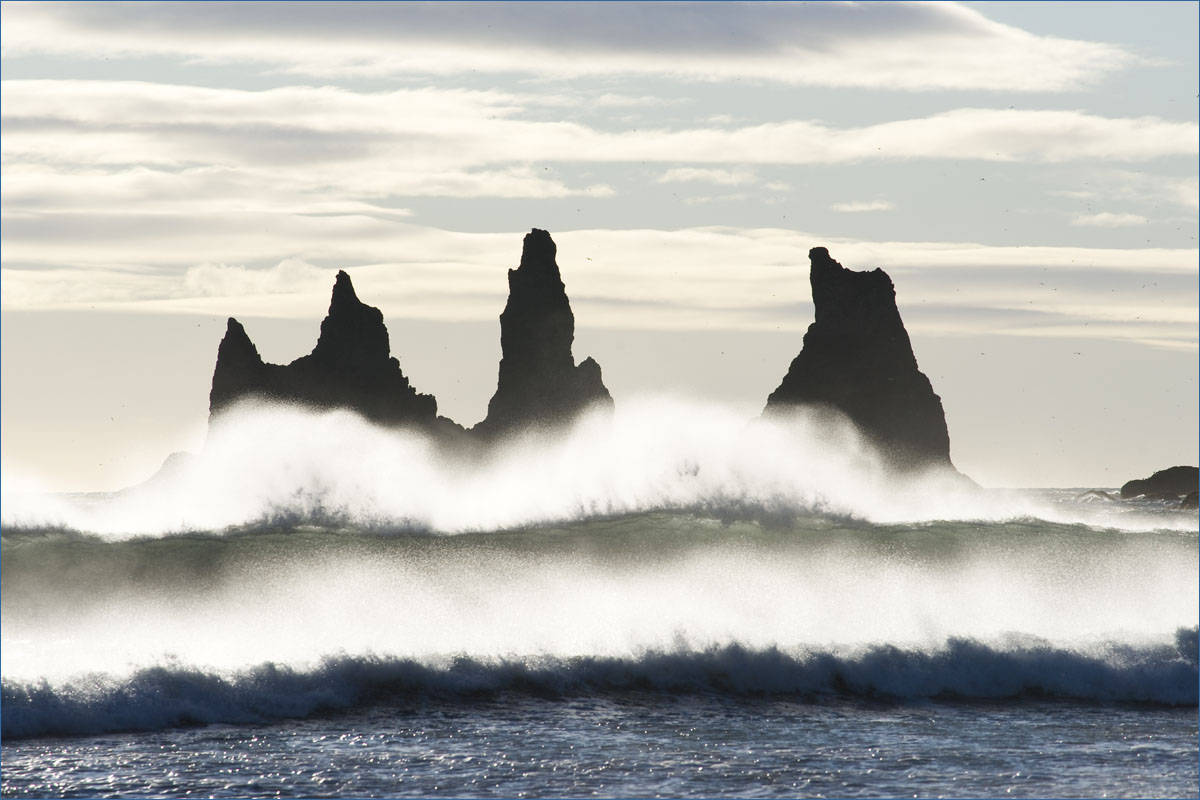 Voor de kust in zee ligt Reynisdrangar, dit zijn zwarte basaltzuilen van zo’n 66 meter hoog.